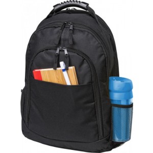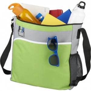 Zipped main compartment, front slip pocket, mesh water bottle pocket, metal key ring. Adjustable shoulder-length strap. 600D of Polyester.