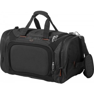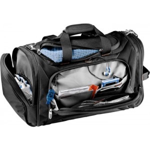 Neotec duffel bag. Large zippered main compartment. One vented side pocket with separate zippered shoe compartment. One vented side wet pocket. Zippered hard EVA shell pocket to protect small electronics. Adjustable and padded shoulder strap and handles. 600D Polyester.
