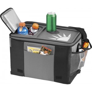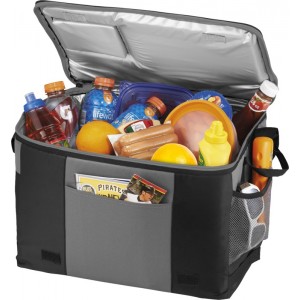 Unique design of this large cooler with easy-access lid and table top function makes it perfect for outdoor events and road trips. Zippered main compartment holds up to 50 cans. Open front pocket. Side mesh pocket. Top easy-access pocket with ‘hook & loop’ closure. Hard top lid. Dual exterior side carry handles. Backsaver® technology combats the strain of carrying a loaded cooler. Ultra Safe™ leak-proof PEVA lining. Collapses for easy storage. 600D of Polyester.
