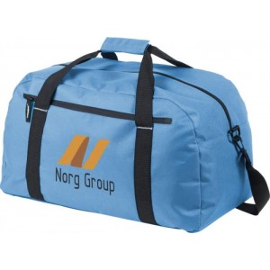 Large travel bag with zipper large main compartment, front zipper pocket and adjustable shoulder strap. 600D of Polyester.