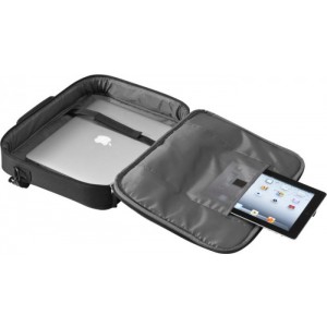 Exclusive design laptop bag with slim compact case has separate protective pockets for both a laptop up to 15.6” and an iPad/10.1” tablet. Front pocket stores bulky power cords neatly in the bottom and out of the way. Organizer panel in front pocket with dedicated storage for external hard drive, pens and other accessories. Zipped front pocket keeps your smartphone secure yet easily accessible. Comfortable, removable shoulder strap and padded handle for easy portability. Luggage strap securely attaches slim case to most rolling luggage.