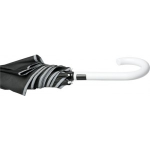 Automatic opening umbrella with a pongee polyester canopy with reflective piping. Sturdy metal shaft, a high quality full fibreglass frame offering maximum flexibility in windy conditions. The crooked handle has an integrated push button. The pongee polyester canopy carries reflective fabric for improved visibility during the darker times of a rainy day. Coloured details are available inside the fibreglass frame and are carried through the handle, tips, and top cap. Large decoration area available on each of the panels. Pongee Polyester.