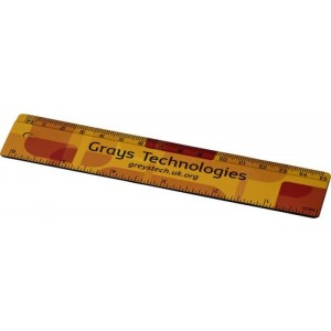 Solid plastic ruler with both markings in inches and centimetres. Recycled plastic.