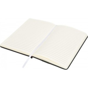 A5 size hard cover notebook, revealing your logo or brand in blue, red, green or yellow after laser engraving. With matching coloured ribbon marker, elastic closure and elastic pen loop. Also features an expandable pocket at the back to keep small notes. Available in the following colours: Black/Lime, Black/ Blue, Black/Red, Black/Grey, Black/Yellow. 80gsm, 80 sheets of cream colour lined paper. Packed in a sleeve. Thermo PU Plastic.