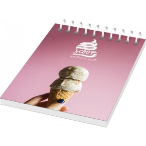 Desk-Mate® wire-o A6 notebook. Desk-Mate® spiral A6 notebook. This notebook includes a white or black wire. Available in different sizes. Includes a glossy card cover (250g/m2) and (80g/m2) blank paper. Standard delivered with 50 sheets, also available with 80 sheets. Decoration possible on the cover and on each sheet. Paper.