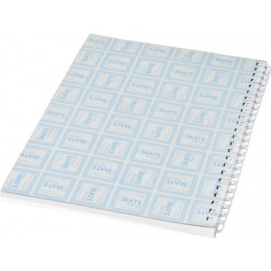 Desk-Mate® wire-o A5 notebook. Desk-Mate® spiral A5 notebook. This notebook includes a white or black wire. Available in different sizes. Includes a glossy card cover (250g/m2) and (80g/m2) blank paper. Standard delivered with 50 sheets, also available with 80 sheets. Decoration possible on the cover and on each sheet. Paper.