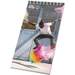 Desk-Mate® wire-o 1/3 A4 notebook. Desk-Mate® spiral A4 notebook. This notebook includes a white or black wire. Includes a glossy card cover (250g/m2) and 50 sheets (80g/m2) blank paper. Decoration possible on the cover and on each sheet. Paper.