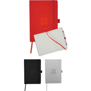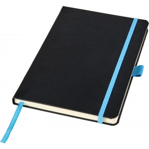 A5 size hard cover notebook, revealing your logo or brand in blue, red, green or yellow after laser engraving. With matching coloured ribbon marker, elastic closure and elastic pen loop. Also features an expandable pocket at the back to keep small notes. Available in the following colours: Black/Lime, Black/ Blue, Black/Red, Black/Grey, Black/Yellow. 80gsm, 80 sheets of cream colour lined paper. Packed in a sleeve. Thermo PU Plastic.