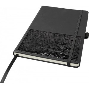 Notebook with reversible sequin in black and silver, delivered in a black Luxe sleeve. Specifications: cover (thermo PU): 15.6 cm x 21.2 cm, 70 g/m2 paper, 80 sheets cream paper, lined format, elastic closure, ribbon marker and a pen loop. Thermo PU Plastic.