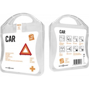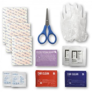 This is an ideal first aid kit to have in every car. With this kit you will be prepared for small accidents and injuries during your journey. Contents: 12 wash proof plasters, 2 skin cleansing swabs, 2 dry swabs, 1 pair of disposable gloves, 1 car clean (2 pack), glass & interior wipe, 1 refreshing wipe, 1 mini scissor. All of the first aid and care products within the kit meet all applicable EU regulations. Price includes full colour print. Plastic.
