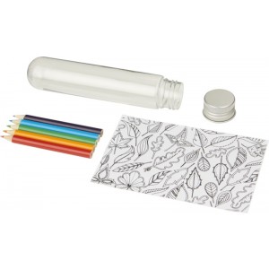 Cami mini doodling set in tube. Set includes 5 coloured pencils and 5 colouring sheets inside a plastic tube with screw-on, metal lid. PE Plastic, Poplar wood.