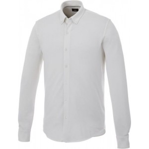 Self fabric collar. Stretch fabric. Adjustable cuff with single pleat. Button-down collar. Satin piping at inside neck. Dyed-to-match engraved buttons. Woven main label. Double piqué knit of 95% Cotton and 5% Elastane, 200 g/m2.