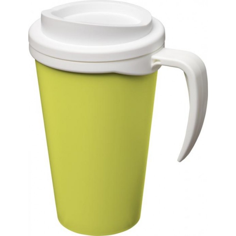 Double-wall insulated mug with twist-on lid and integrated handle. Mix and match colours to create your perfect mug. Contact customer service for additional colour options. Made in the UK. Presented in a white gift box. PP Plastic.