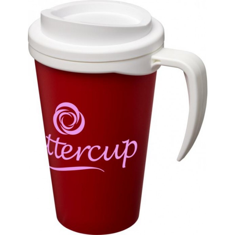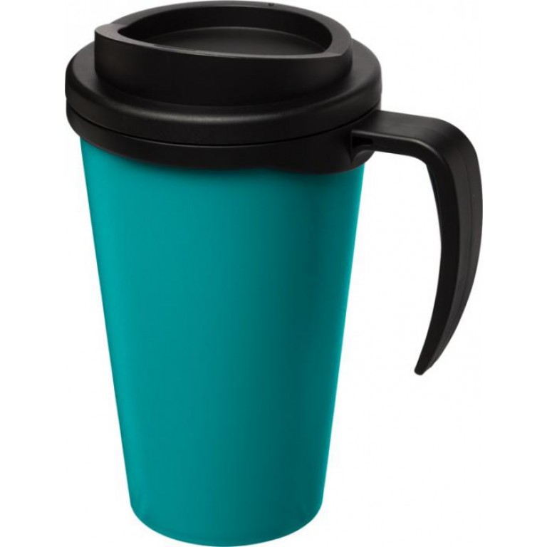 Double-wall insulated mug with twist-on lid and integrated handle. Mix and match colours to create your perfect mug. Contact customer service for additional colour options. Made in the UK. Presented in a white gift box. PP Plastic.