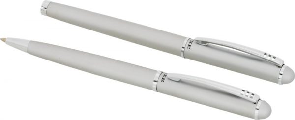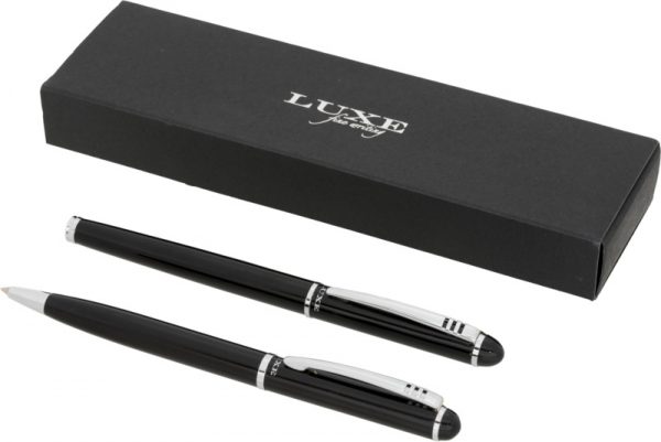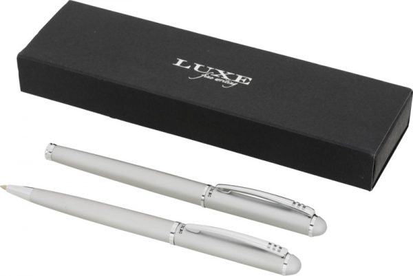 Exclusively designed twist ballpoint pen and cap type rollerball pen set. Available in Glossy Black, Matt Silver and Matt Blue. Packed in a ”LUXE” gift box. Metal.