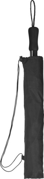 Automatic opening 23” foldable two-section umbrella. Pongee polyester canopy with geometric design. Metal shaft with fibreglass ribs, rubberized handle with wrist strap. Including storage pouch. Polyester.