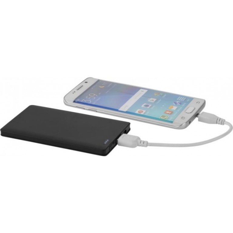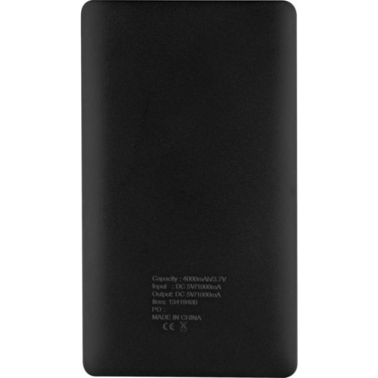 Austin 4000 mAh power bank. This 4000 mAh rechargeable lithium polymer Grade A battery is enough to charge smartphones, MP3 players and more. Reusable power bank charges via USB cable (included) which can recharge the battery backup or be used to charge devices with micro-USB input like Android smartphones from Samsung, Motorola, HTC, Nokia, and others. Four blue LED lights illuminate to indicate charging level. Input: 5V 1000mA. Output: 5V 1000mA. Packed in a black carton box. Plastic.