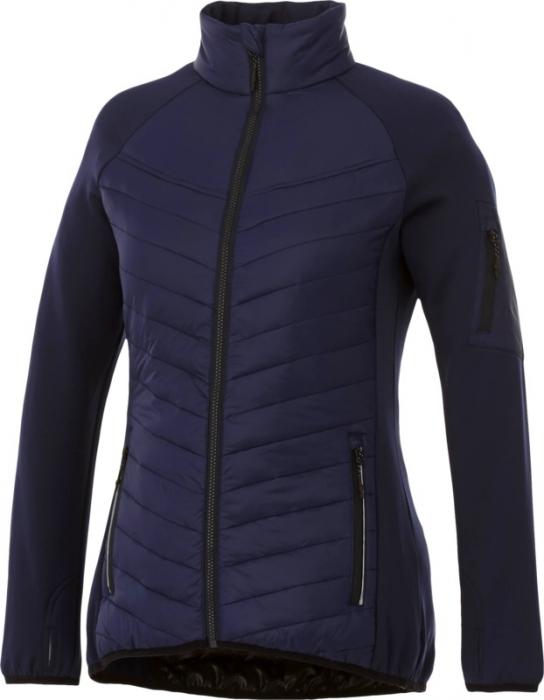Quilted body and knitted contrast fabric. Interior media pocket. Elastic drawstring with adjustable cord lock. Shaped seams and tapered waist for flattering fit. Chin guard. Hand pockets with zippers. Centre front exposed plastic zipper. Hanger loop. Bi-coloured necktape. Flag label at side seam. Dull cire 380T woven with PA coating and water repellent finish of 100% Nylon, 190 g/m2, Contrast fabric, Brushed back sweater knit of 100% Polyester, Padding/filling, synthetic insulation of 100% Polyester.