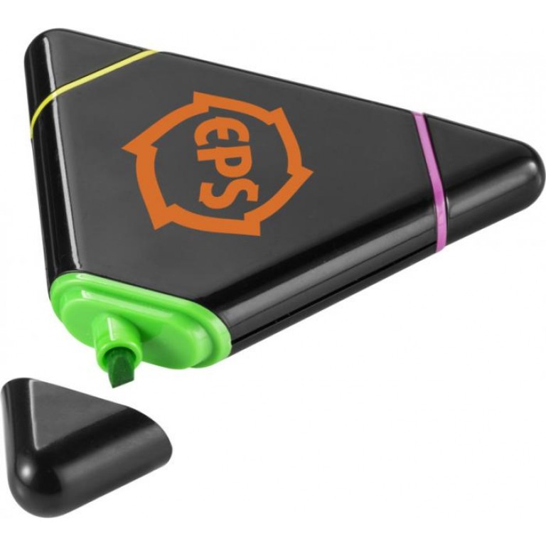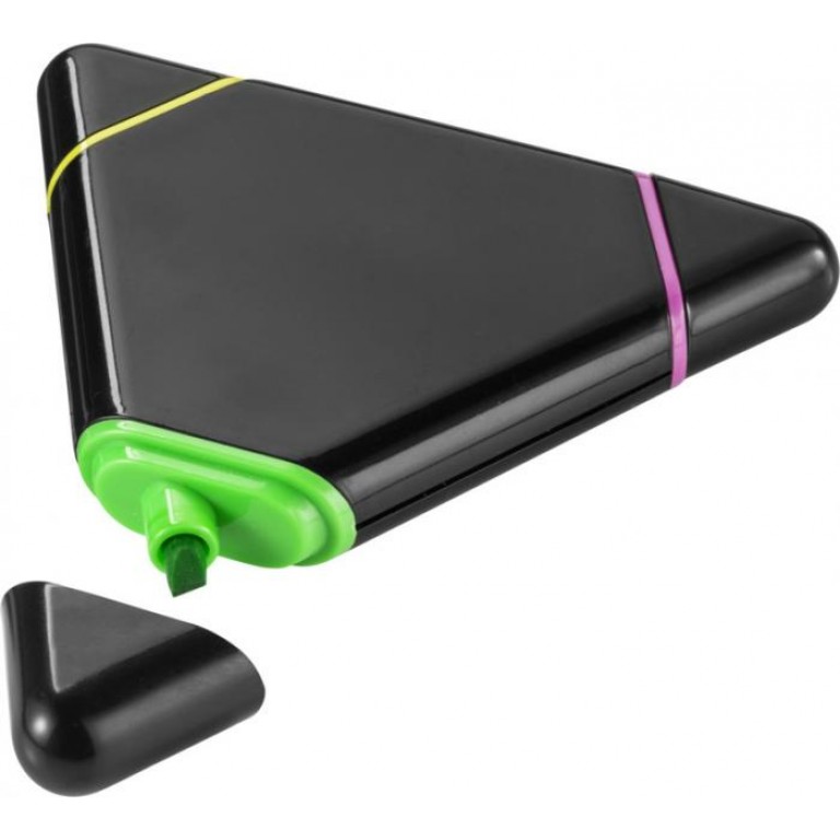 Triangle-shaped highlighter with chisel tip in yellow, pink and green. ABS Plastic.
