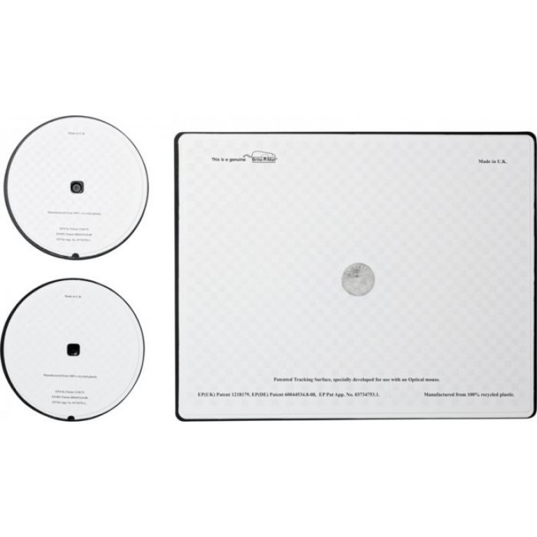 Supplied with a Brite-Mat mouse mat and a set of matching coasters. The set comprises of a rectangular mousemat (0.3 x 19 x 24 cm) and two square coasters (0.3 x 9.5 x 9.5 cm). Recycled plastic, Laminated paper, Black masterbatch.