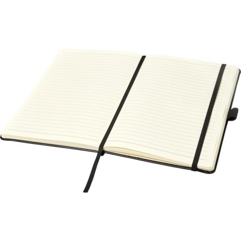 A5 size hard cover notebook, revealing your logo or brand in blue, red, green or yellow after laser engraving. With matching coloured ribbon marker, elastic closure and elastic pen loop. Also features an expandable pocket at the back to keep small notes. Available in the following colours: Black/Lime, Black/ Blue, Black/Red, Black/Grey, Black/Yellow. 80gsm, 80 sheets of cream colour lined paper. Packed in a sleeve. Thermo PU Plastic.