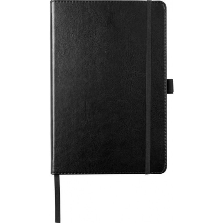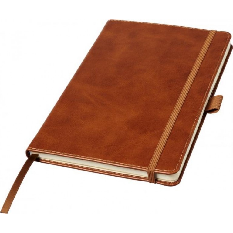 Leather-look (thermo PU) hardcover A5 notebook with stitches around the edges and a round spine, delivered in a Luxe sleeve. Specifications: 70 g/m2 paper, 80 sheets cream paper, lined format, back pocket, elastic closure, ribbon marker, and a pen loop. Cowhide thermo PU Plastic.