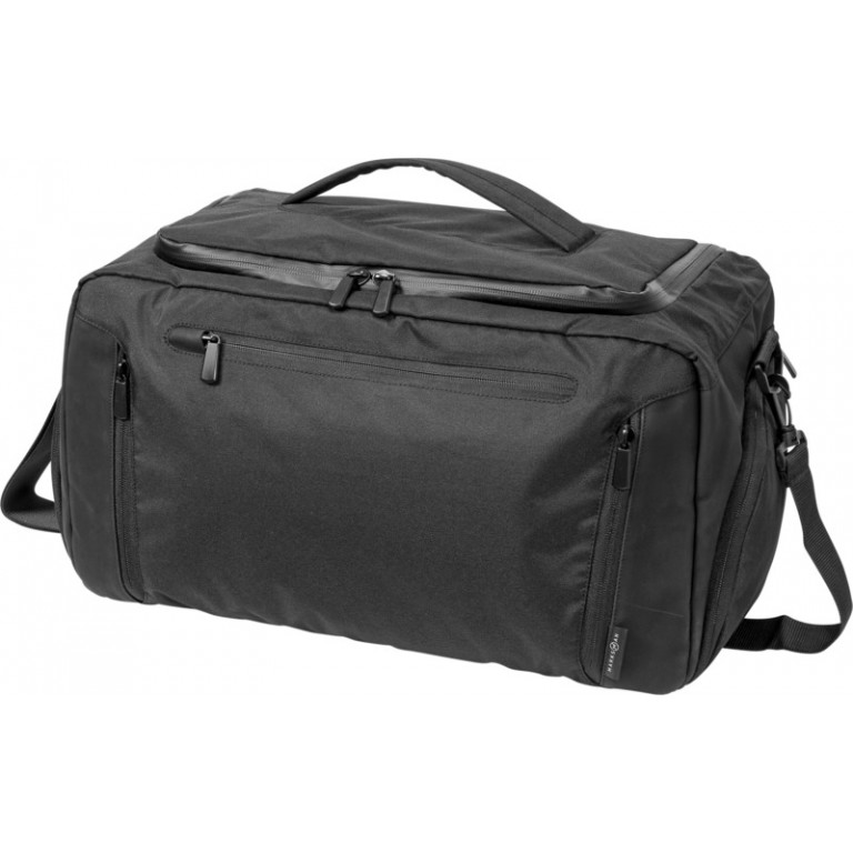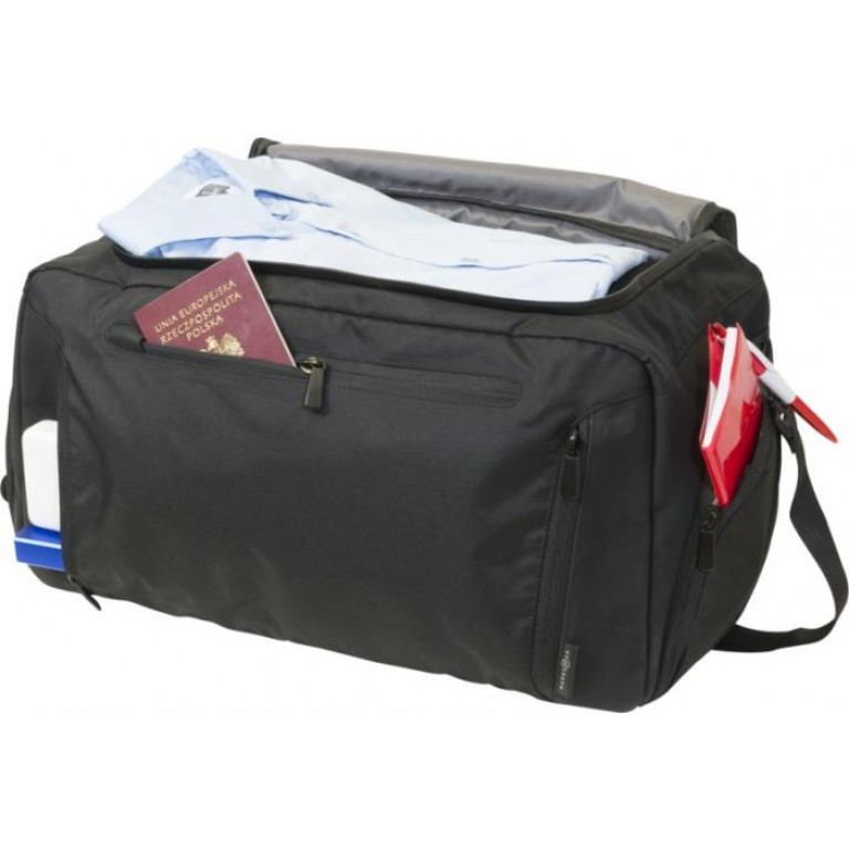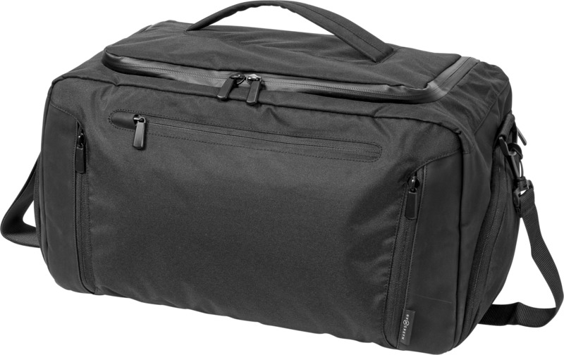 Deluxe travel duffel bag with rear zipped tablet pocket to travel in style. The front zippers allow you to pack your cables or additional clothes in separate compartments. Includes a removable shoulder strap and two side zipped compartments, one for your shoes and another for additional quick-access storage. Large U-shaped opening for easy access along with two additional interior pockets. Exclusive design from Marksman. 300D of Polyester.