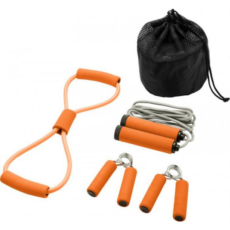 Dwayne fitness set. Fitness set with all the tools needed for a perfect work-out. Two hand grip trainers, skipping rope and chest expander in matching colour material. Comes in a mesh pouch for easy carrying and has a large decoration area. Polyester. 0,36.