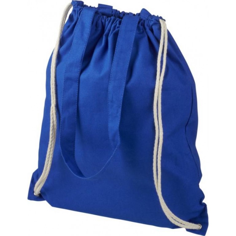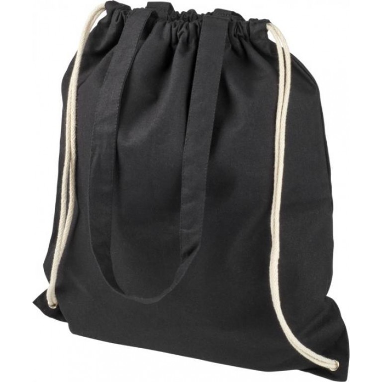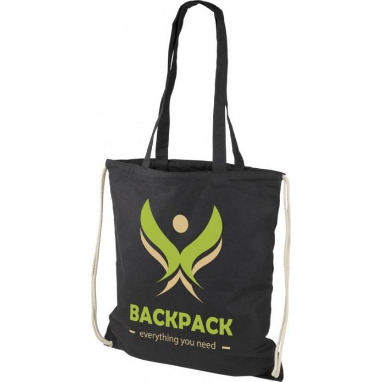 Multi-functional cotton bag with long handles and drawstring which can be carried as tote or backpack. Large main compartment with drawstring closure. Features two dropdown handles length of 31 cm. Capacity: 1.5 L, resistance up to 5 kg weight. Cotton, 240 g/m2.