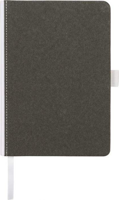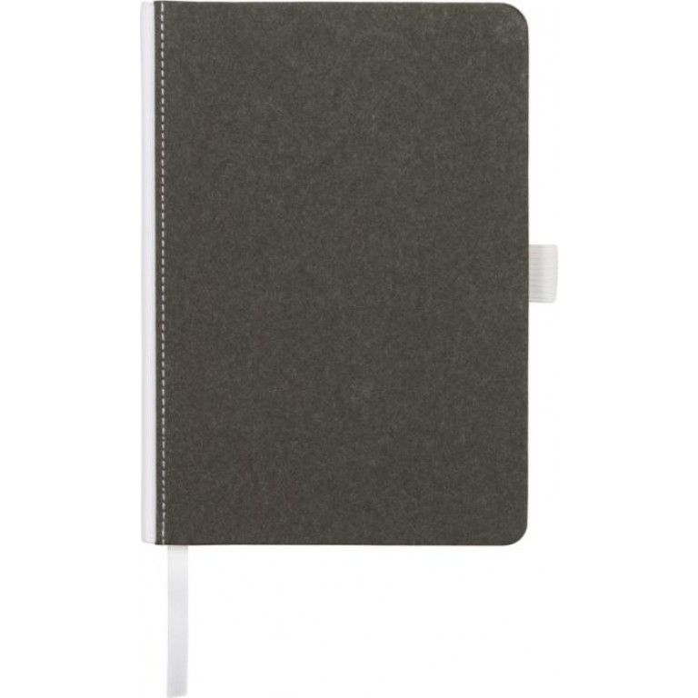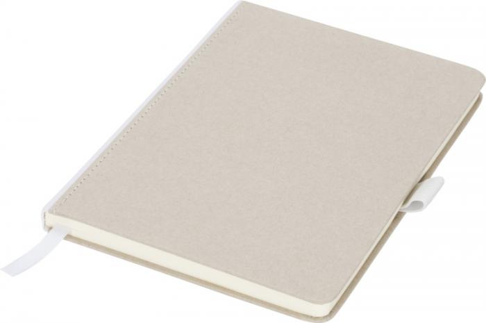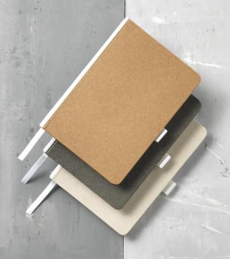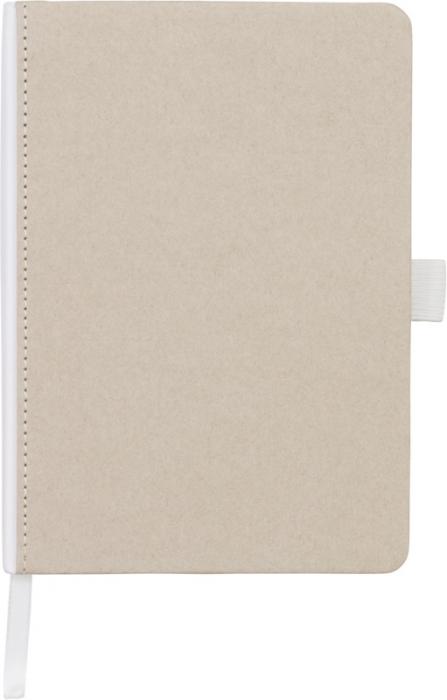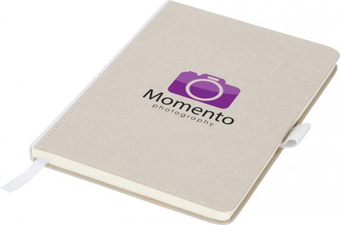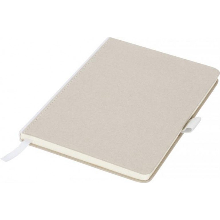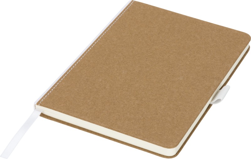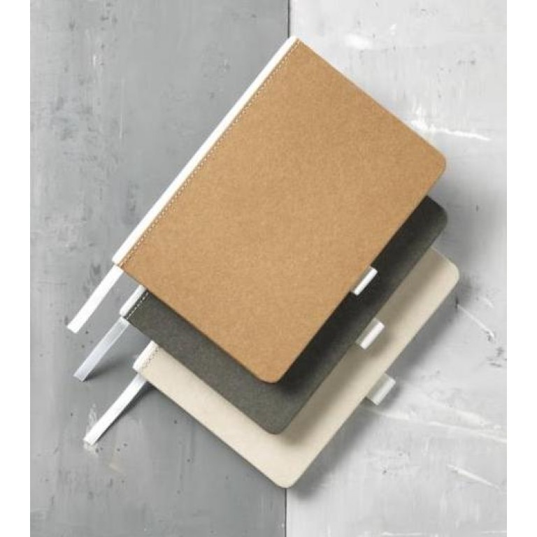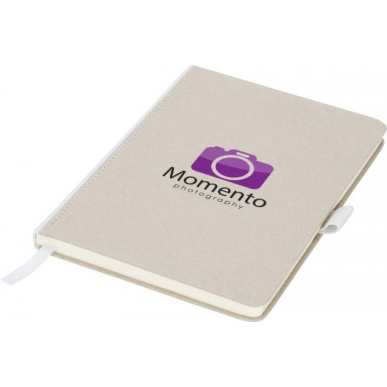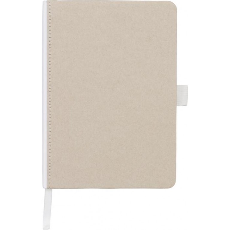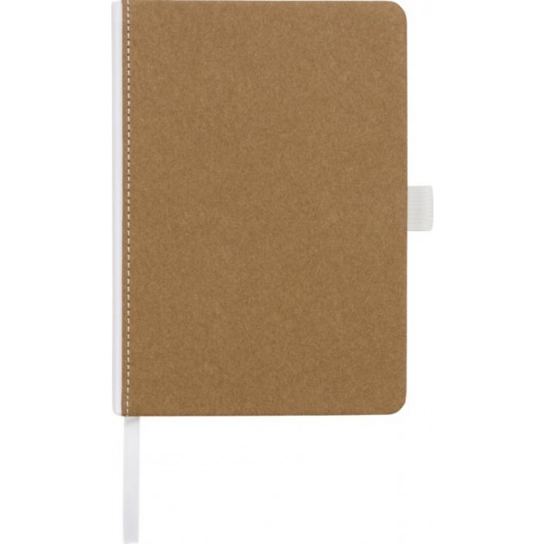 Natural look cardboard notebook with fabric spine. Features 80 (70gsm) blank sheets, a ribbon marker, and a pen loop. Cardboard.