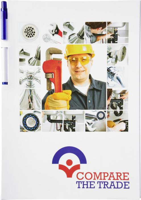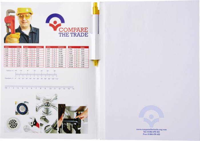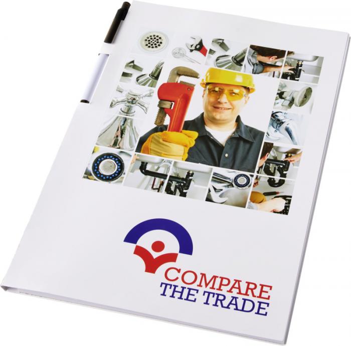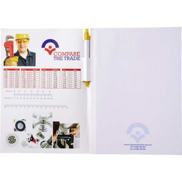 Essential conference pack A4 notepad and pen. Essential conference pack A4. Includes an A4 notepad with 50 sheets (80g/m2) blank paper and a calypso pen in the spine area. The conference pack has a hard cover (350g/m2). Full colour decoration possible on both sides of the cover, as well as on each sheet. Paper.