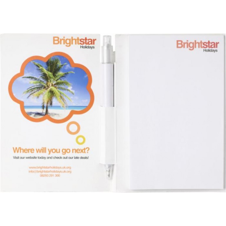 Essential conference pack A6 notepad and pen. Essential conference pack A6. Includes an A6 notepad with 50 sheets (80g/m2) blank paper and a calypso pen in the spine area. The conference pack has a hard cover (350g/m2). Full colour decoration possible on both sides of the cover, as well as on each sheet. Paper.