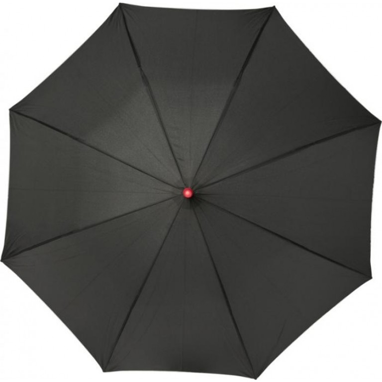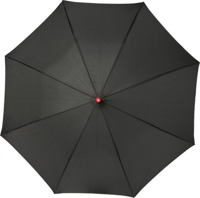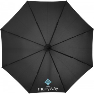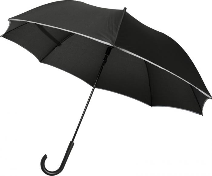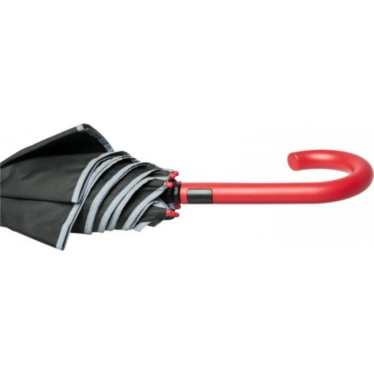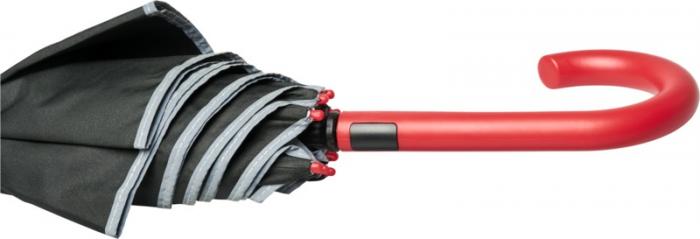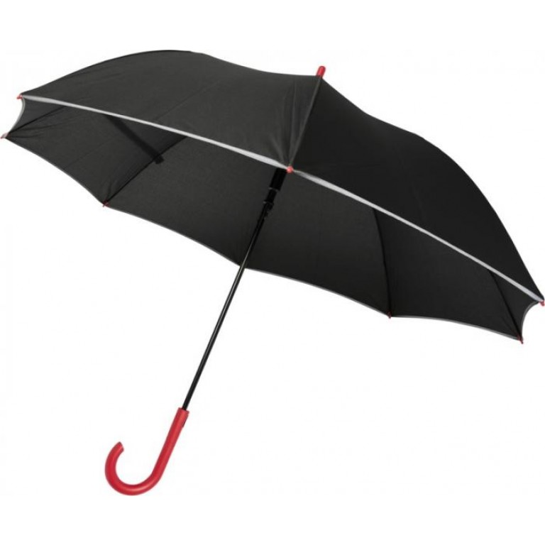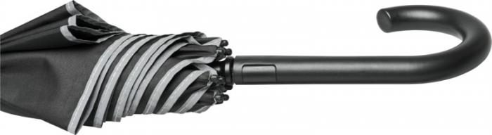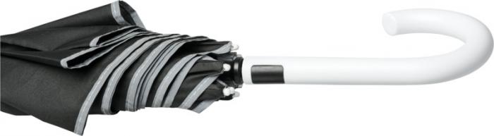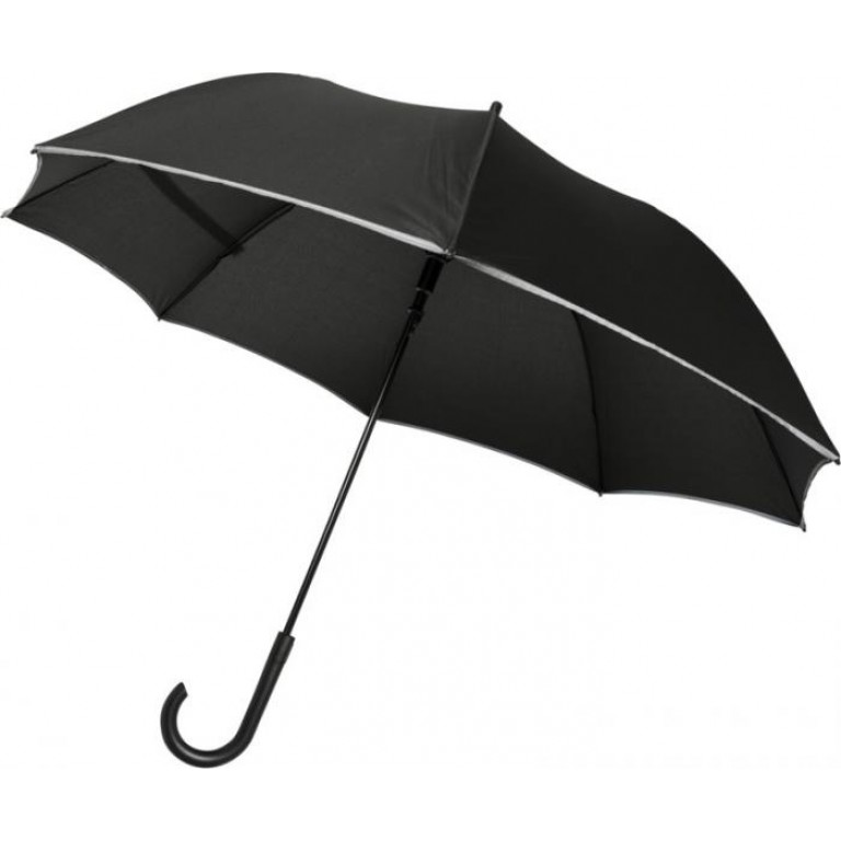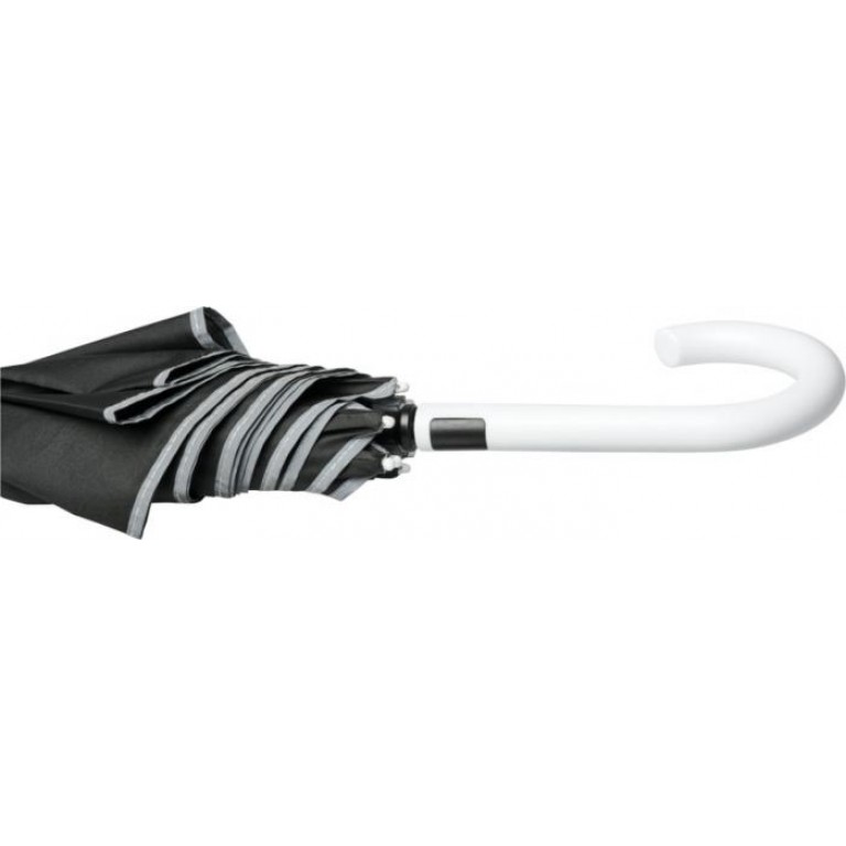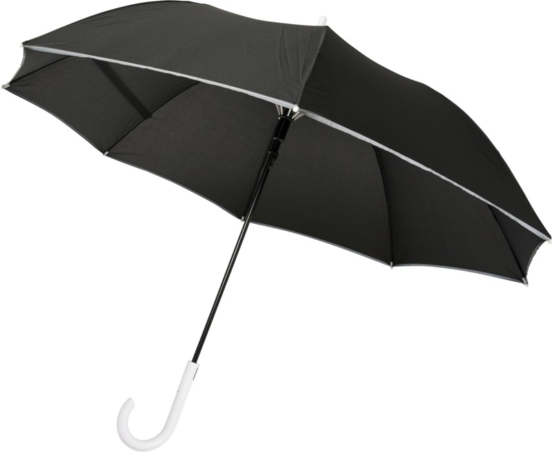 Automatic opening umbrella with a pongee polyester canopy with reflective piping. Sturdy metal shaft, a high quality full fibreglass frame offering maximum flexibility in windy conditions. The crooked handle has an integrated push button. The pongee polyester canopy carries reflective fabric for improved visibility during the darker times of a rainy day. Coloured details are available inside the fibreglass frame and are carried through the handle, tips, and top cap. Large decoration area available on each of the panels. Pongee Polyester.