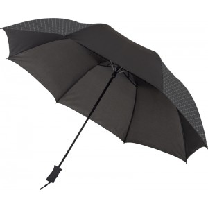 Automatic opening 23” foldable two-section umbrella. Pongee polyester canopy with geometric design. Metal shaft with fibreglass ribs, rubberized handle with wrist strap. Including storage pouch. Polyester.