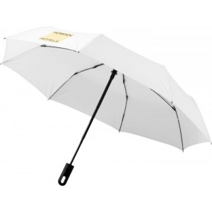 Exclusive design automatic open and close 3-section umbrella. Metal black shaft, fiberglass ribs and rubber coated plastic handle. Supplied with matching canopy colour pouch. Folds up to 31cm. Pongee Polyester.