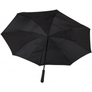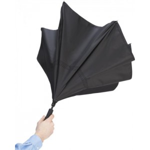 23″ Innovative design reverse folding umbrella. Opens and closes “inside-out” making it easier to use when getting in and out of a car by keeping the water contained and outer surfaces dry. The umbrella stands on its own when closed allowing the water to drain out to dry. Windproof frame with fibreglass ribs. Manual opening with a push button pinch-proof runner and dual layer polyester canopy. Pongee Polyester.