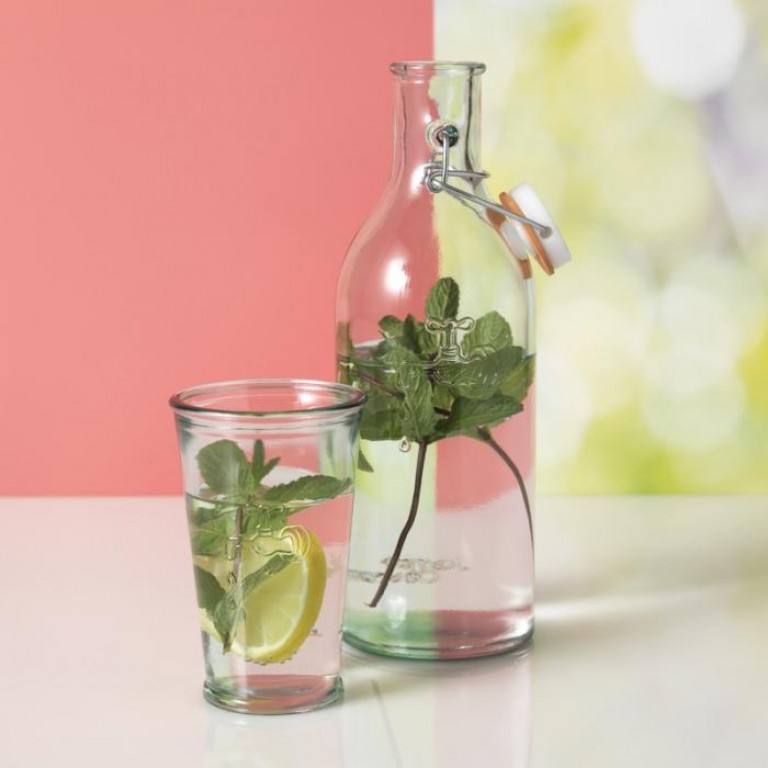 Water bottle and glass recycled from 5 Marmalade jars. Made from 100% recycled glass. Dishwasher safe. Supplied in Jamie Oliver gift box. Exclusive design. Recycled glass.