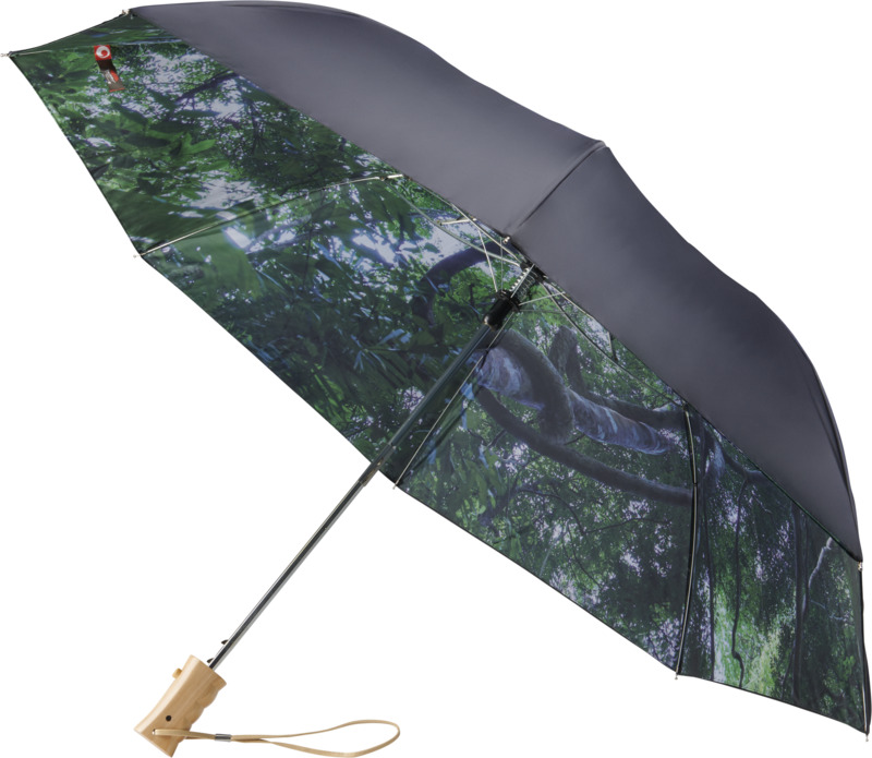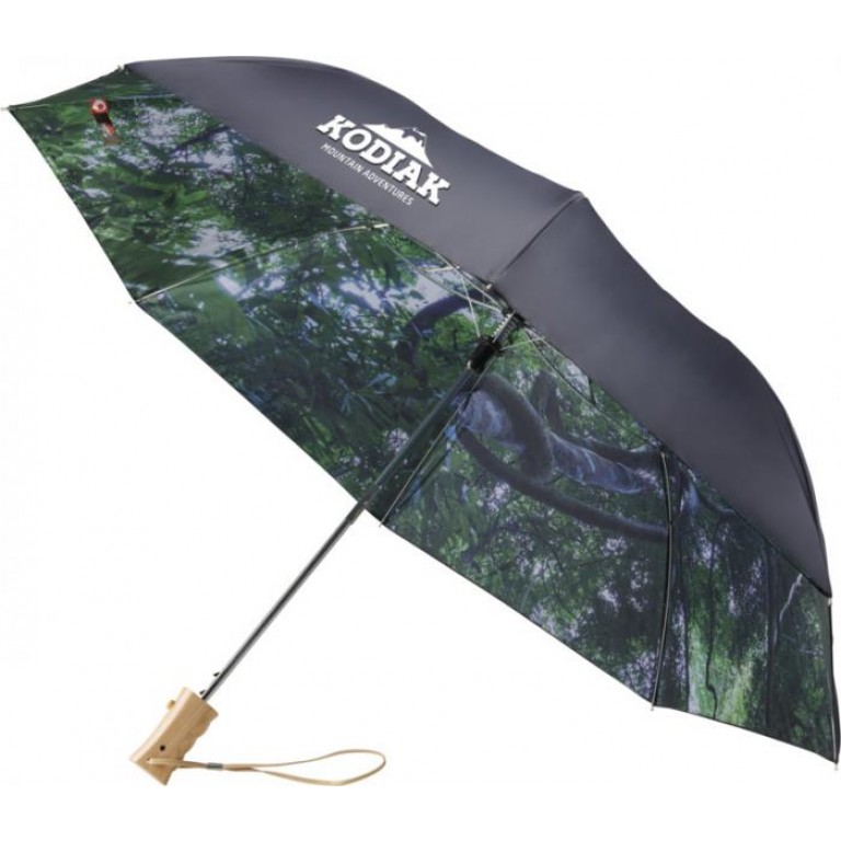 21″ Automatic opening two section folding umbrella. Dual layer polyester canopy with matching polyester pouch. Forest pattern on interior canopy. Metal shaft and wood handle with wrist strap. Polyester.
