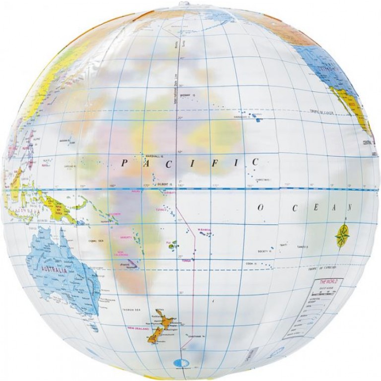 Inflatable beach ball with globe imprint and compliant with EN71. PVC.