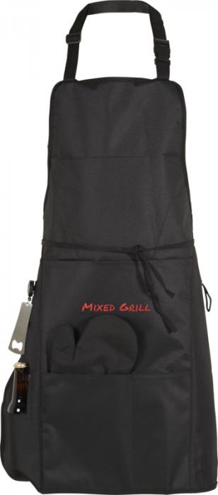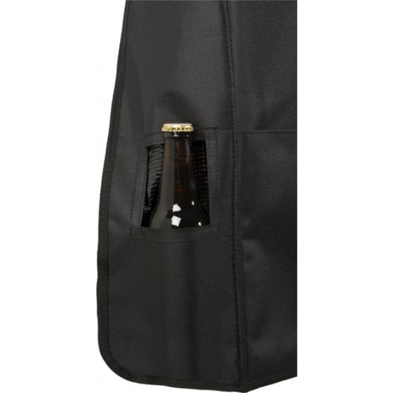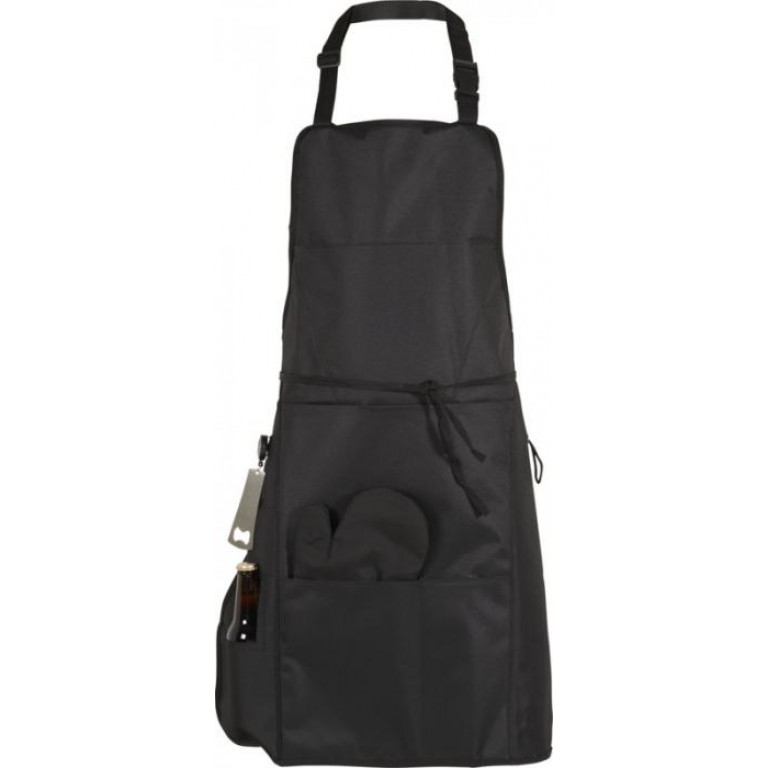 This apron keeps your BBQ tools within easy reach. Features an insulated pocket for keeping beverage bottles cold, a detachable bottle opener, padded oven mitt and towel loop as well as two front pockets to store other grilling essentials. 600D of Polyester, Stainless Steel, Cotton.