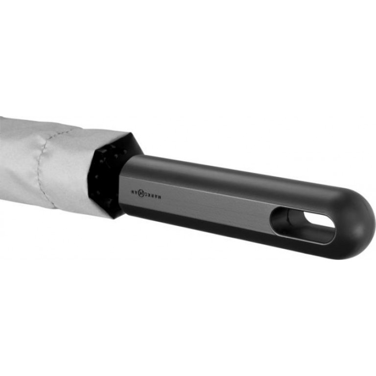 Exclusive design umbrella with automatic open function. Metal shaft and ribs. Special design handle to easily hang the umbrella on the table. Rubbercoated crook handle with aluminium detail. Matching colour pouch. Pongee Polyester.
