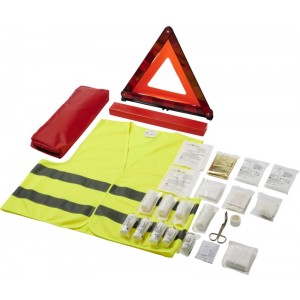 Complete car safety set in case of an unfortunate situation. Large decoration area at the front of the pouch. One adult sized reflective safety vest, a warning triangle, and a first aid emergency set according to DIN13164 regulations. The warning triangle is regulated by the European Standard EC R27 and has approval number 27R-043555. The high visibility reflective vest Class 2 comes in XL size and is suitable for persons with height between 165-180 cm and has specification EN ISO 20471:2013+A1:2016. These garments bear CE marking to demonstrate compliance with EU Regulation 2016/425/EU Personal Protective Equipment Category II. The emergency set holds 36 pieces of first aid supplies and is regulated according to DIN13164: 93/42/EEC. Polyester.