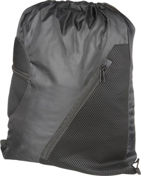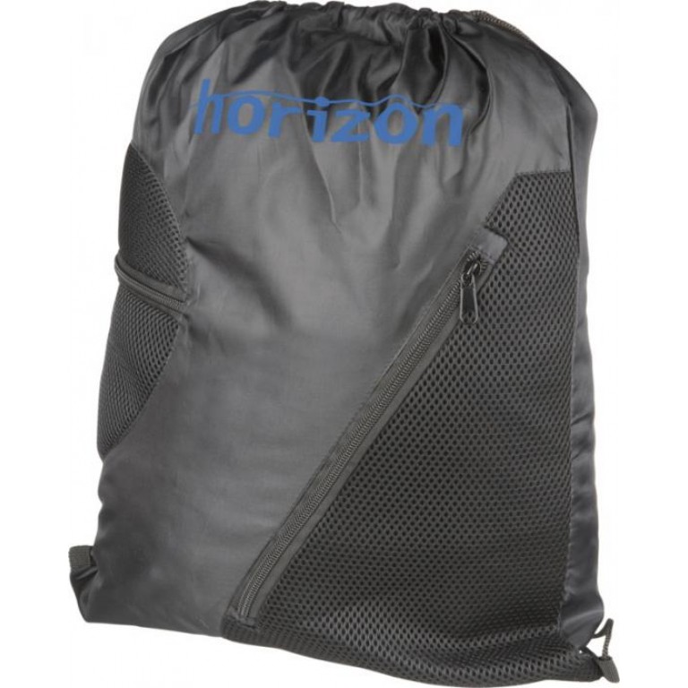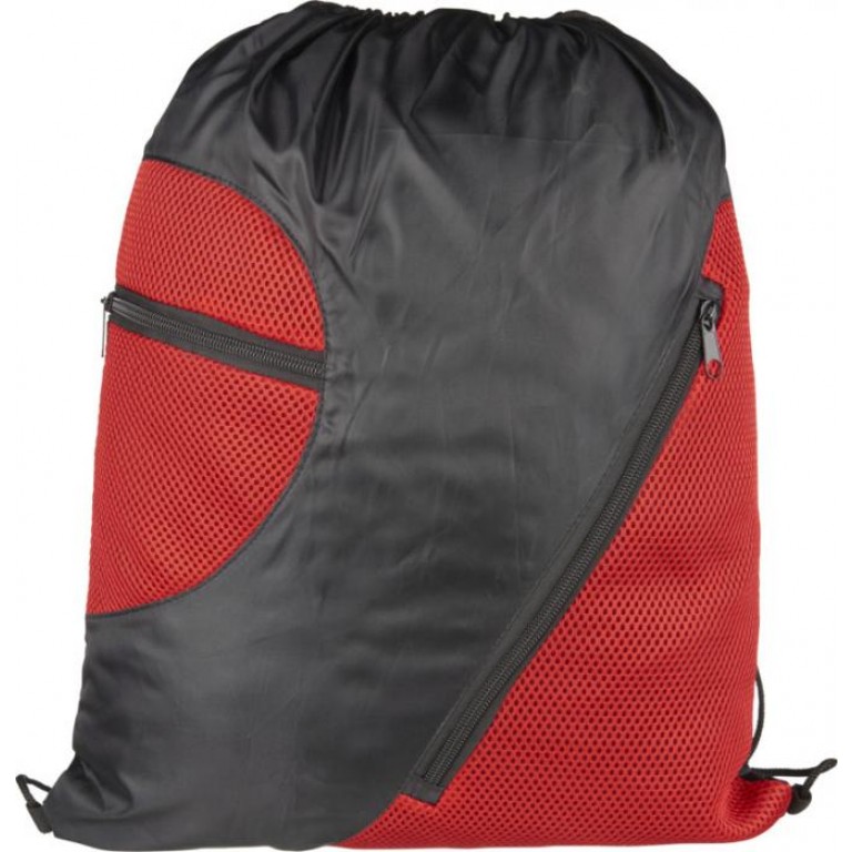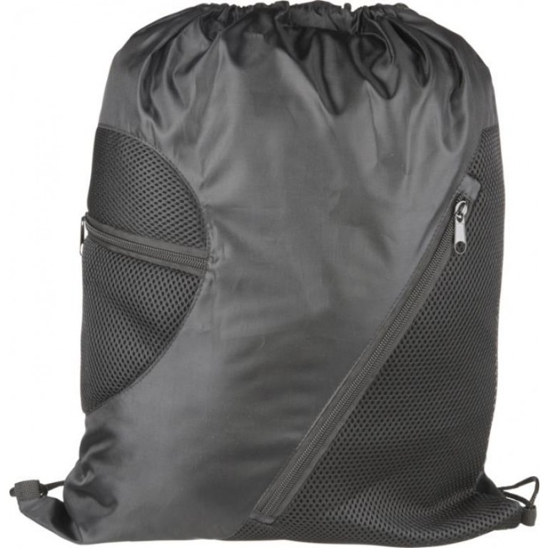 Large main compartment with drawstring rope closure. Two front zippered mesh pockets for additional storage. 210D of Polyester.