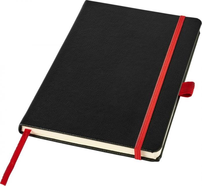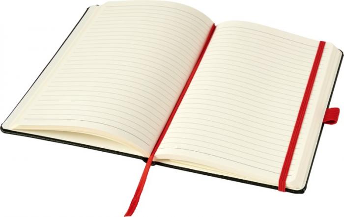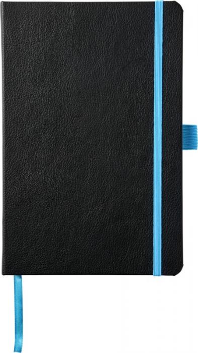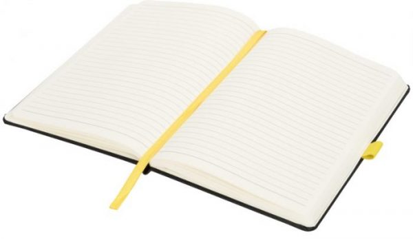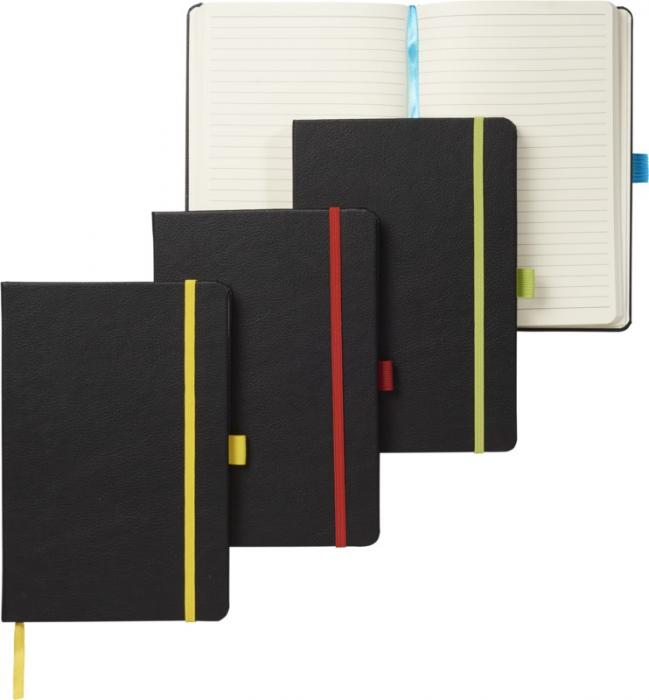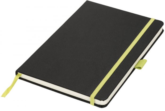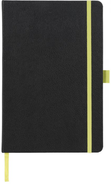 A5 size hard cover notebook, revealing your logo or brand in blue, red, green or yellow after laser engraving. With matching coloured ribbon marker, elastic closure and elastic pen loop. Also features an expandable pocket at the back to keep small notes. Available in the following colours: Black/Lime, Black/ Blue, Black/Red, Black/Grey, Black/Yellow. 80gsm, 80 sheets of cream colour lined paper. Packed in a sleeve. Thermo PU Plastic.