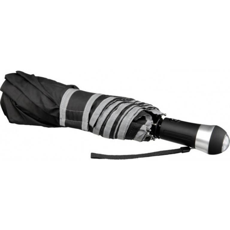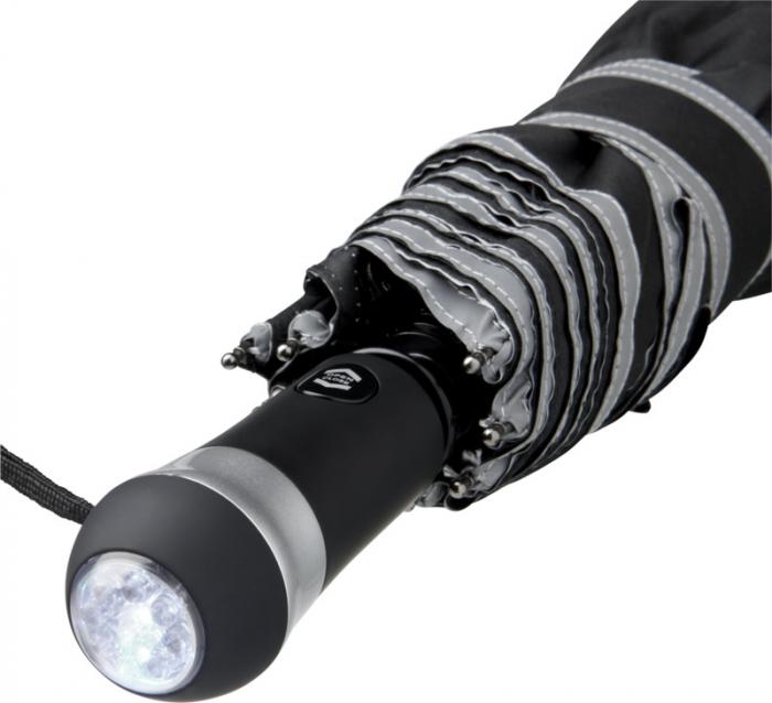 Luminous 27″ LED fold. auto. open/close umbrella. Automatic open and close umbrella with bright revolving LED light integrated in comfortable rubberized handle. Sturdy black metal hexagonal shaft with fiberglass ribs. Including matching colour storage pouch. The pongee polyester canopy carries reflective fabric for improved visibility during the darker times of a rainy day.3 batteries included. Pongee Polyester.