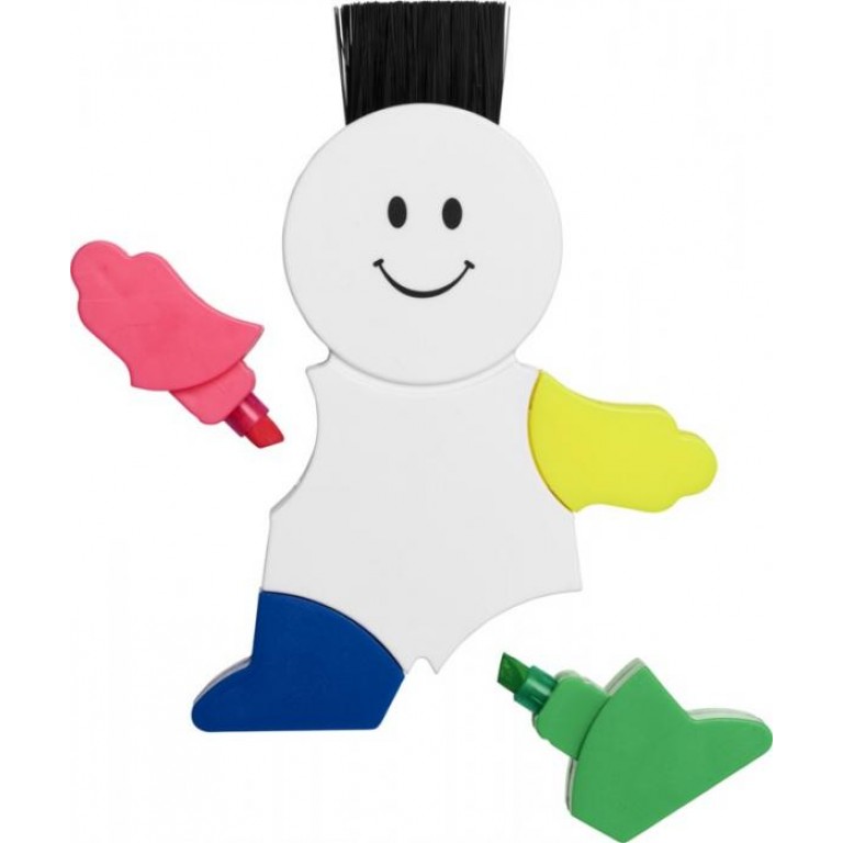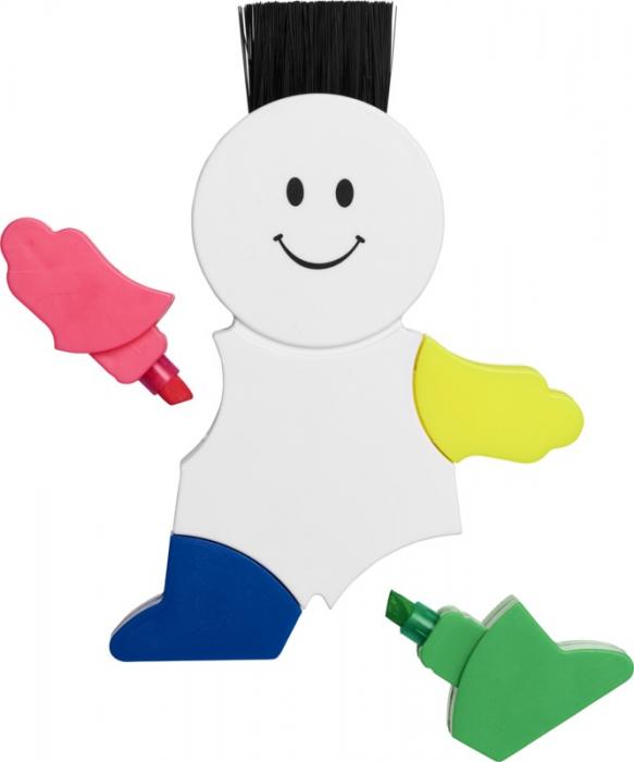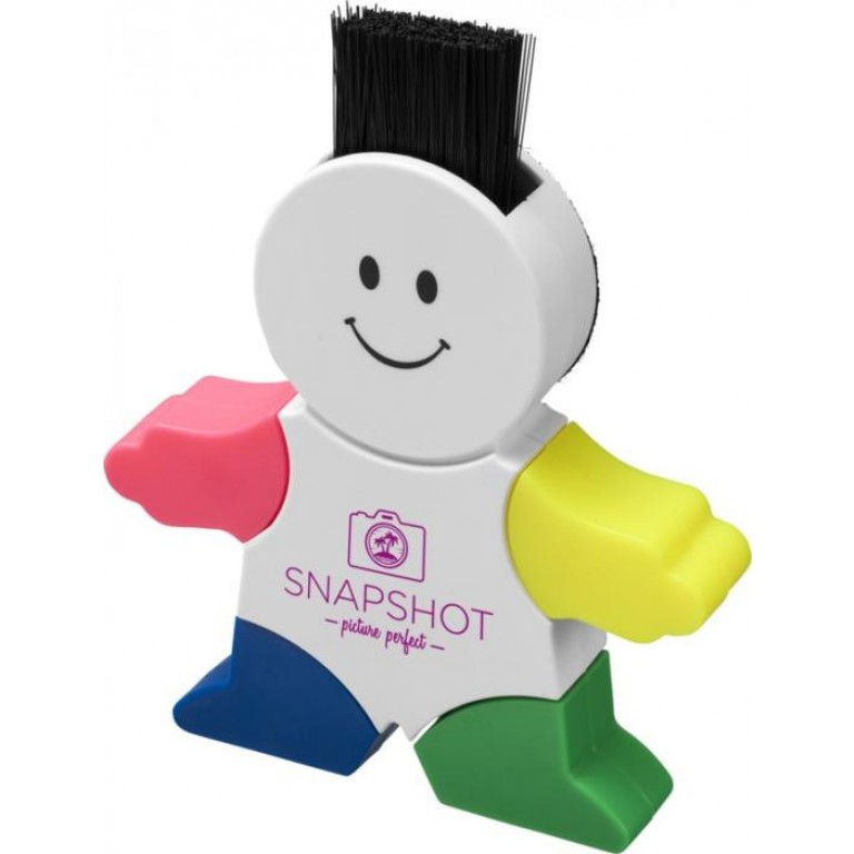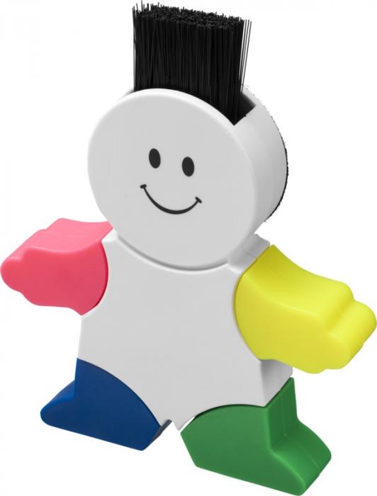 Multifunctional highlighter with keyboard brush, screen cleaner and four coloured highlighter in pink, blue, green, and yellow. Plastic.