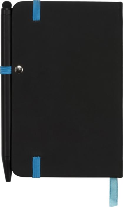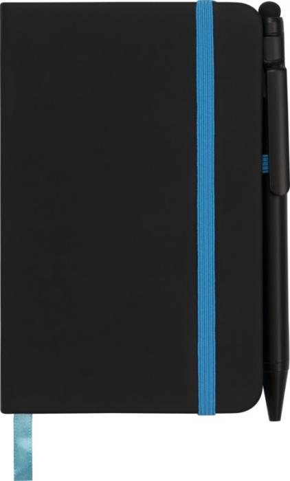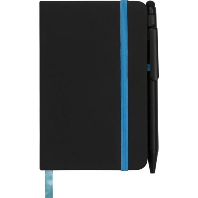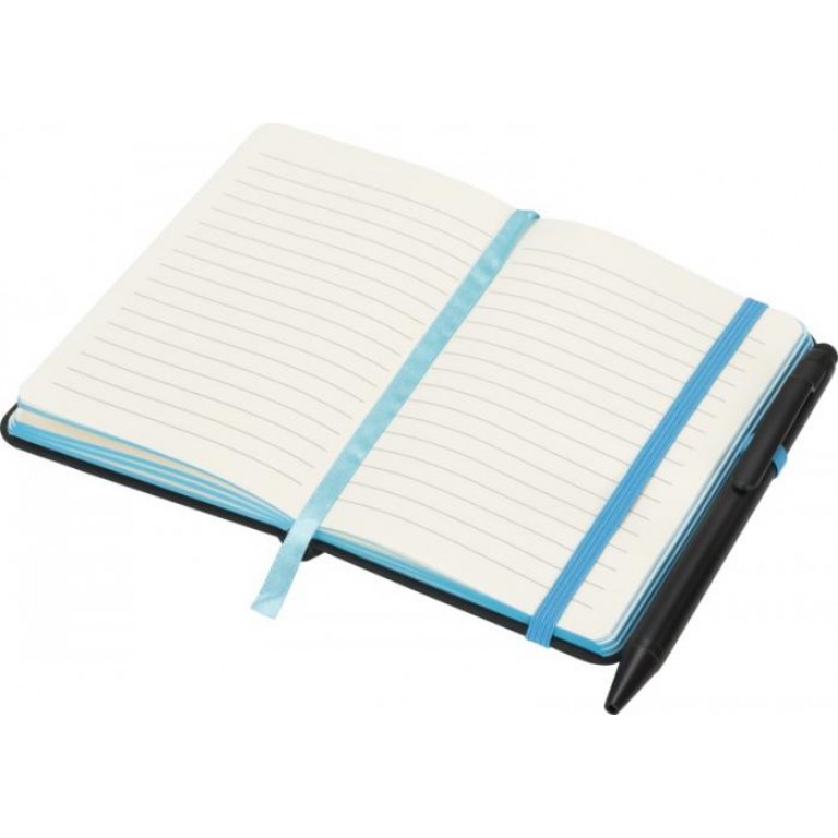 Modern and stylish black notebook, with a soft-feel tactile cover. Supplied with coloured edging and matching coloured page marker, pen loop and closure strap. Supplied with a plain black stylus ballpoint pen. Inlcudes 96 sheets (70g/m2) cream lined paper. PU Plastic.