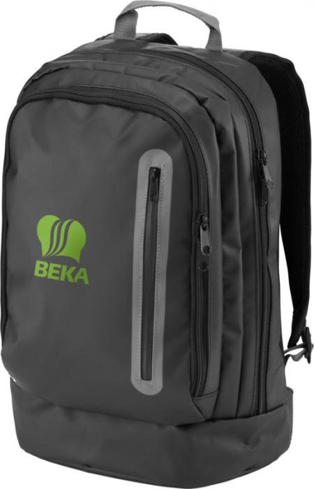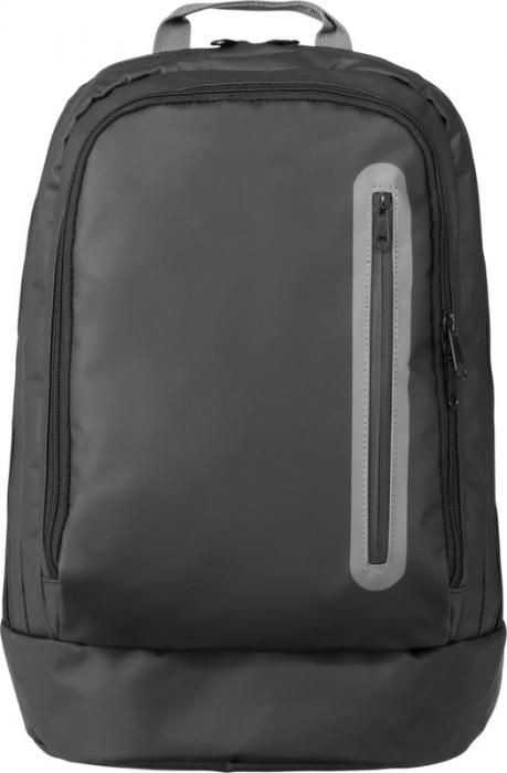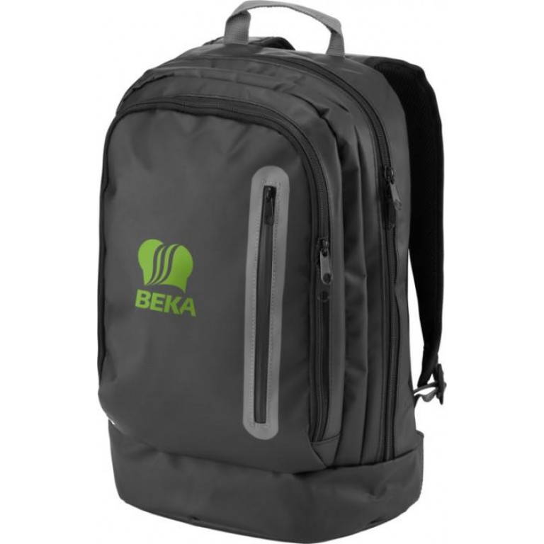 Exclusive design waterresistant backpack with zippered main compartment with laptop compartment will fit most 15,4″ laptops. Zippered midd compartment with slash pocket for small accessoires like phone. Vertical zippered front pocket. Adjustable padded shoulder straps and reinforced top carry handle. Tarpaulin.