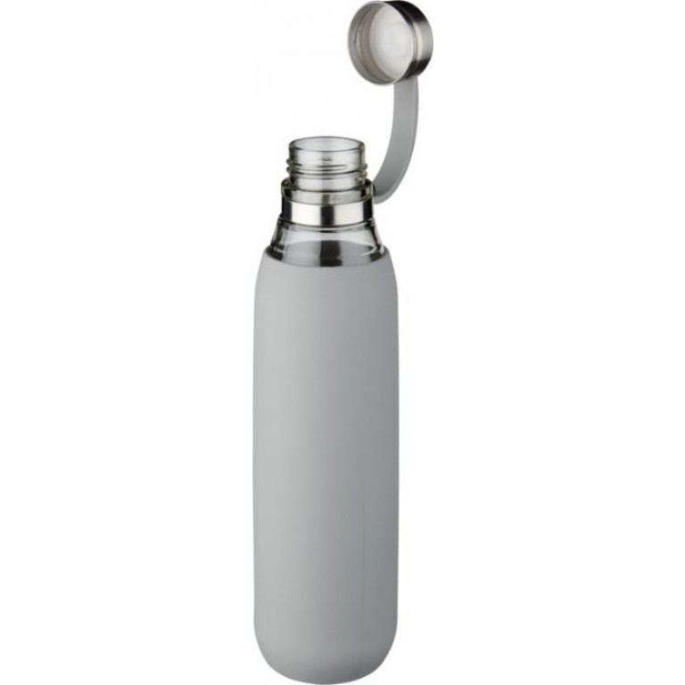 Single-wall glass bottle wrapped in a soft grip silicone sleeve with non-slip bottom. Features a screw-on top and stainless steel lid with a comfortable silicone handling loop. Do not freeze, do not microwave. Volume capacity is 650ml. Presented in an Avenue gift box. Glass, Silicone Plastic.