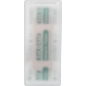 Portable mini box containing 5 adhesive plasters sized 56x19mm, intended to use on minor cuts and abrasions. The plaster box offers a large decoration area. The adhesive plasters are regulated, tested, and certified as Medical Device Class I in accordance with Medical Device Directive MDD 93/42/EEC of 14 June 1993. PP Plastic.